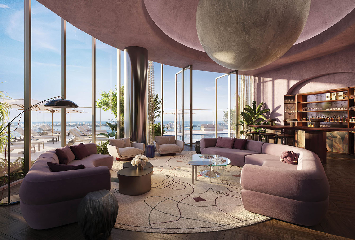 The building comprises 329 residences with private and semi-private elevator vestibules, 10- to 11-foot ceiling heights, and floor-to-ceiling windows that draw the sky directly into the living space. Generous balconies with glass railings create a continuous indoor–outdoor experience, while select corner residences enjoy immersive 180-degree vistas. Residence kitchens are inspired and vetted by two Michelin-starred chef Jean-Georges, featuring Gaggenau appliance packages, deep functional islands, and two distinct finish schemes—Dawn and Dusk—that balance bright coastal tones with richer, moodier palettes.